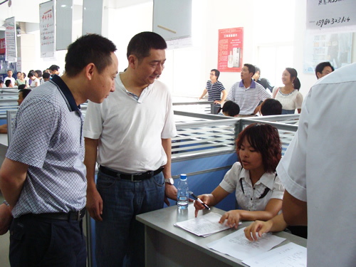 東坡區(qū)人事局局長(zhǎng)田中文(左一)、區(qū)勞動(dòng)和社會(huì)保障局局長(zhǎng)詹金松(左二)親臨招聘會(huì)現(xiàn)場(chǎng)視察